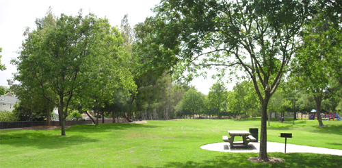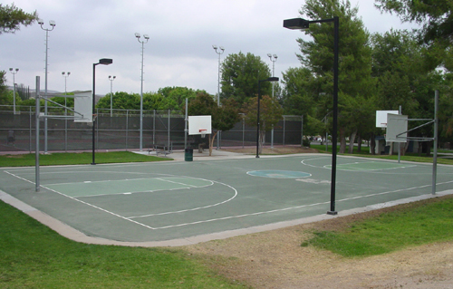 Park with lighted basketball court, lighted softball diamond and lighted tennis court, bbqs, child play area, picnic tables. Public restrooms. Parking lot.